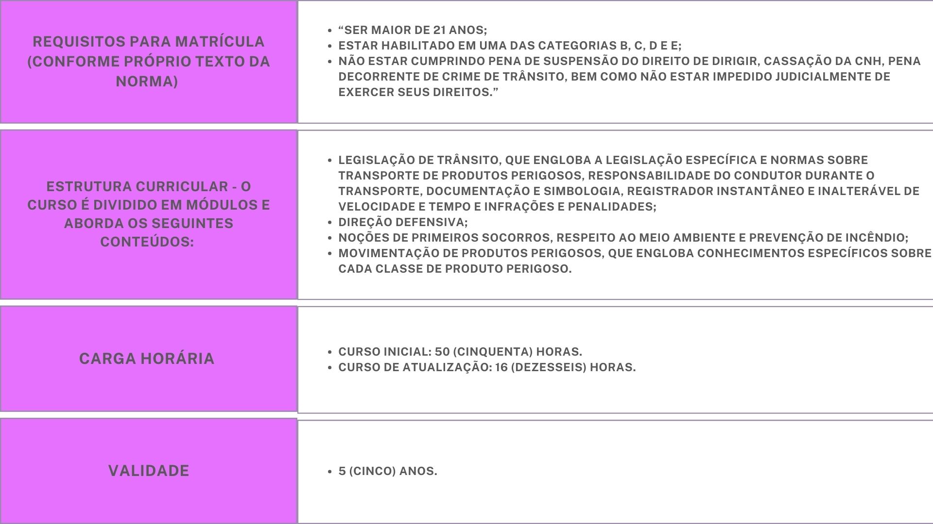 Todas as diretrizes, requisitos, estrutura curricular do curso e demais informações pertinentes podem ser consultadas através do site do Ministério dos Transportes, na página dedicada às Resoluções – CONTRAN.